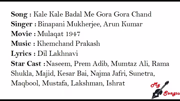 Song- Kaale kaale baadal mein gora gora chaand (Mulaaqaat)(1947) Singers- Binapani Mukherjee, Arunkumar Mukherjee, Lyricist- Munshi Dil Lucknowi, MD- Khemchand Prakash